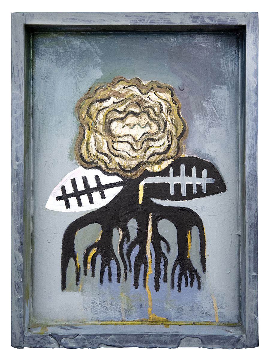Emulsion, oil, paint pens, dipped string, cardboard, papier-mâché, foamcore, wire mesh, key, nail, paintbrushes and gold chain on salvaged wood.