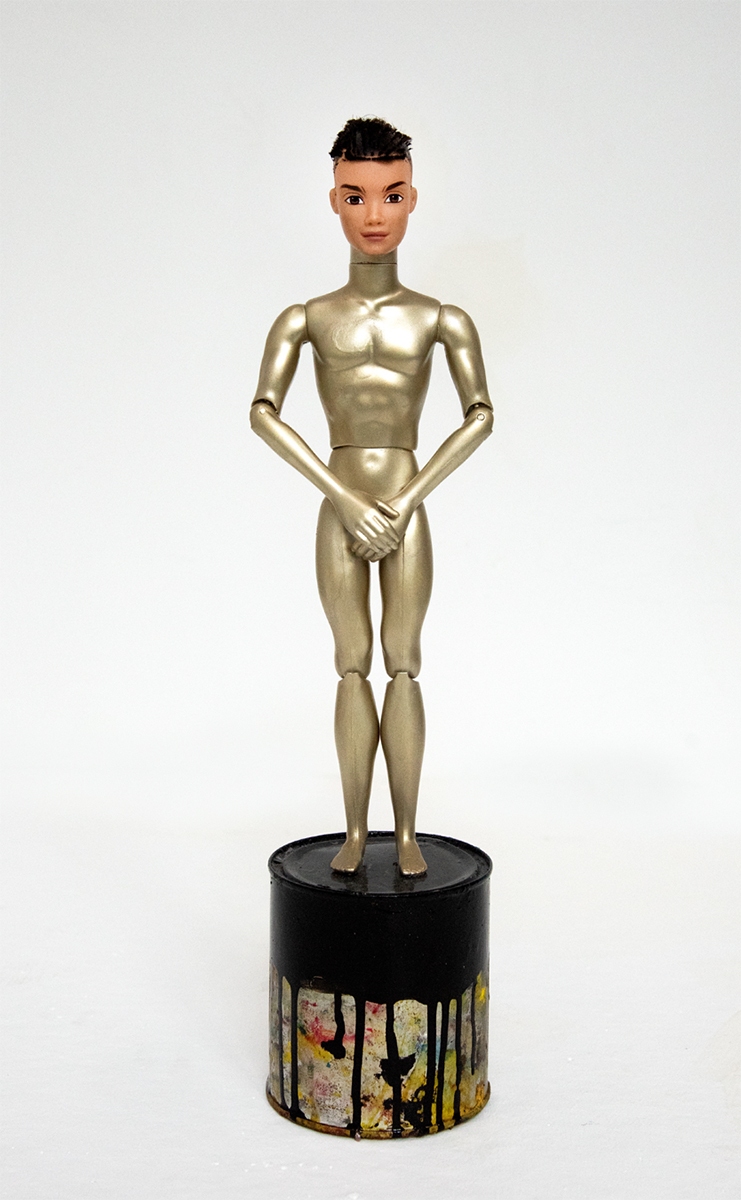 Oil, emulsion, acrylic, paint pens, nails, string, whisky miniature, brush head, plastic star and faux leather on model horse, wood, guitar and plastic toy cows