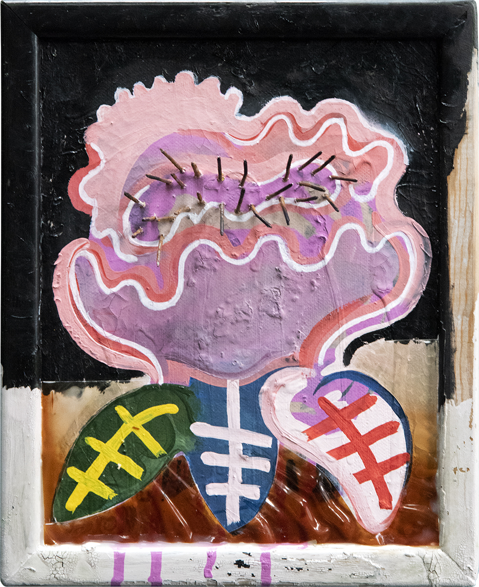 Emulsion, chalk pens, sunburnt plastic and rusted nails on framed canvas