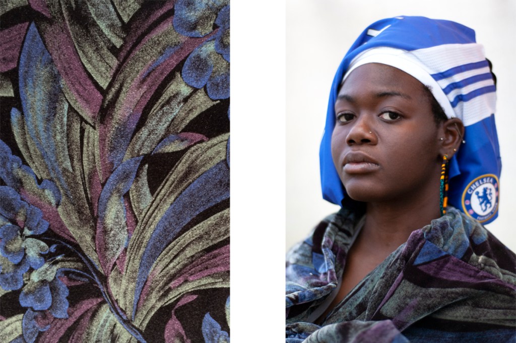 Abena Poku wears a winter gown made of salvaged material stripped from armchairs found dumped in a Bristol Industrial estate. The photograph is informed by worldwide statue debates, fashion photographs and subverts common African > European aesthetic orders and poses.