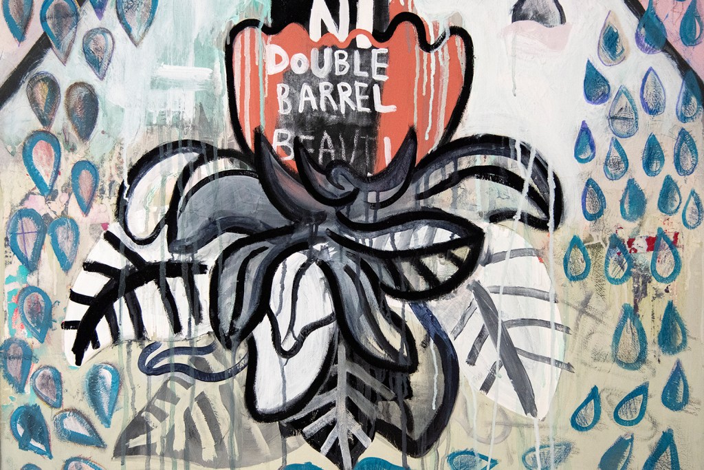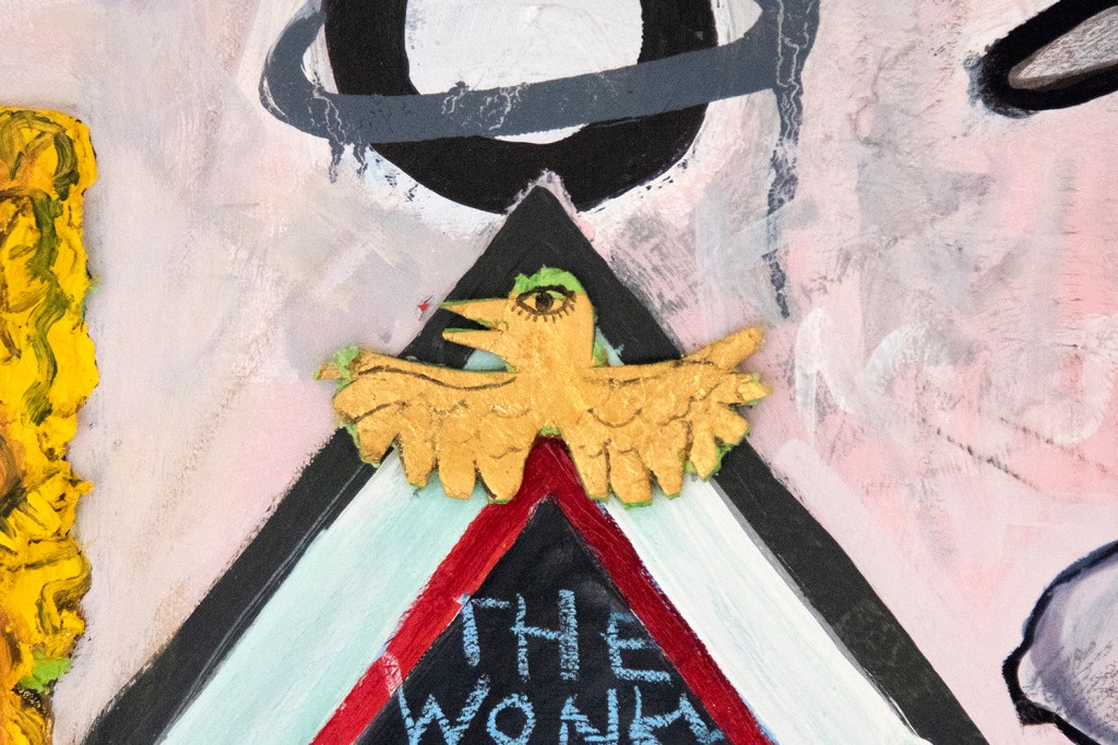Paper, oil, papier-mâché, acrylic, paint pens and chalk on framed canvas.