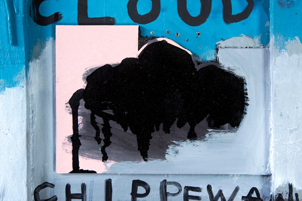 Emulsion, felt tip and paint pen on foamcore, cardboard and canvas in nailed wood frame bound with shoe laces.