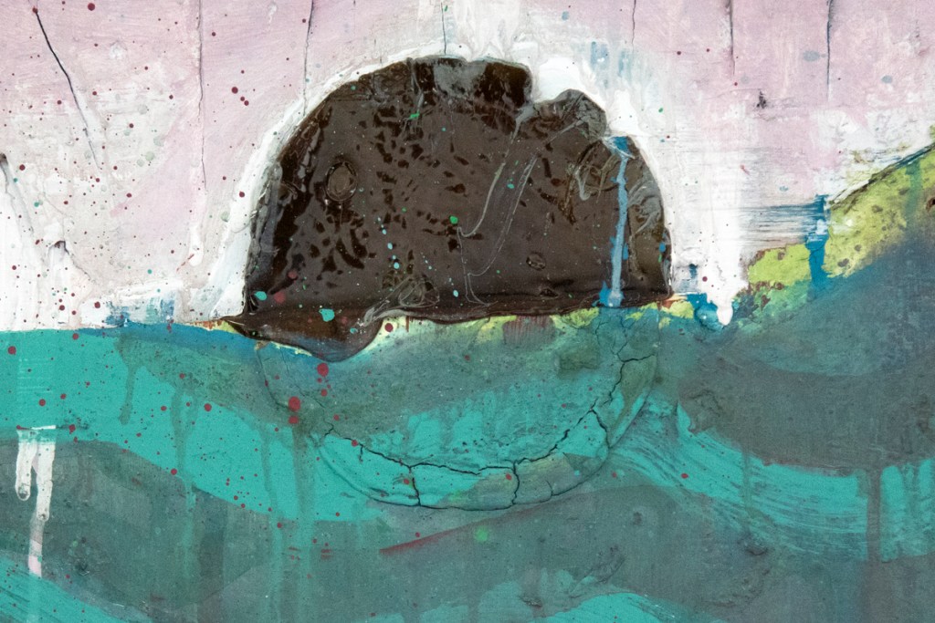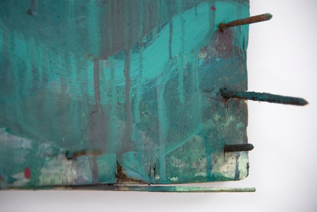 Emulsion resin, water colours and rusted nails on delaminated ply.