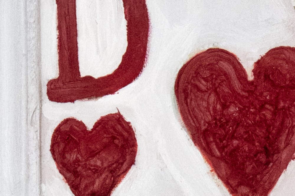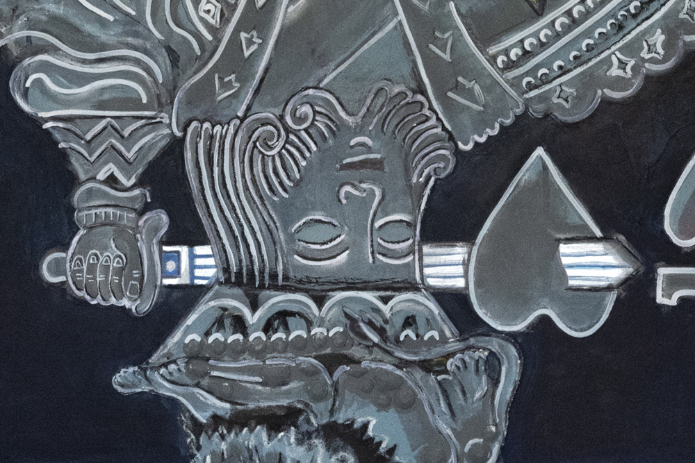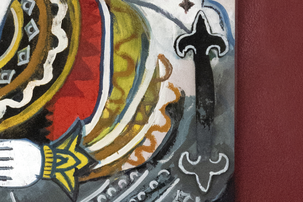 Oil, emulsion, paint pens, crayon, glitter, postage stamp, plastic jewels, chrome on cardboard, wood and iron handles in corner-only frame.
