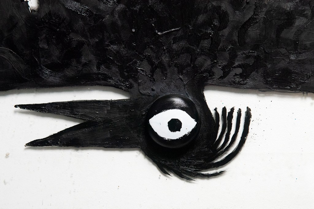 A crow seen hanging upside down from a TV aerial.