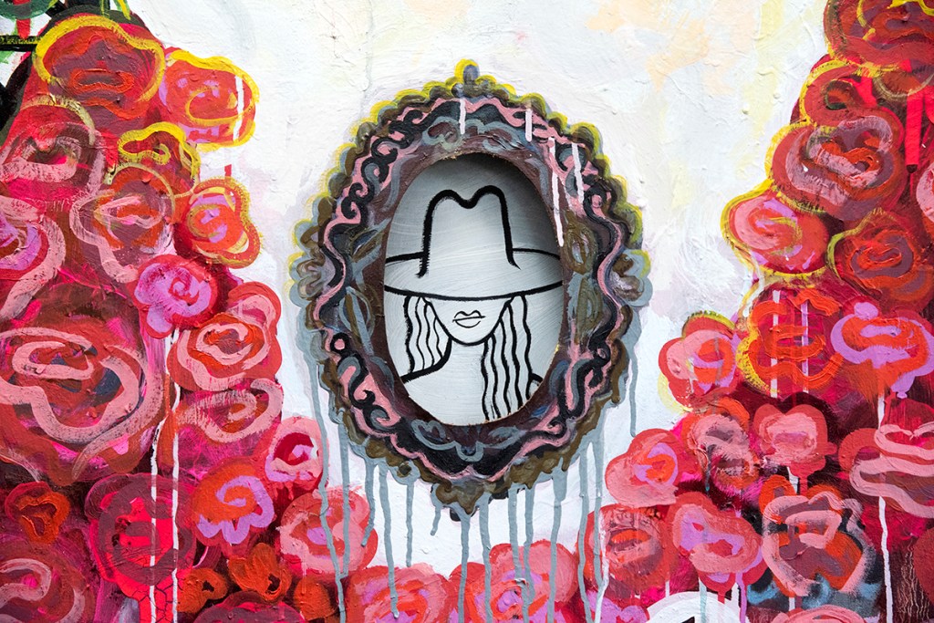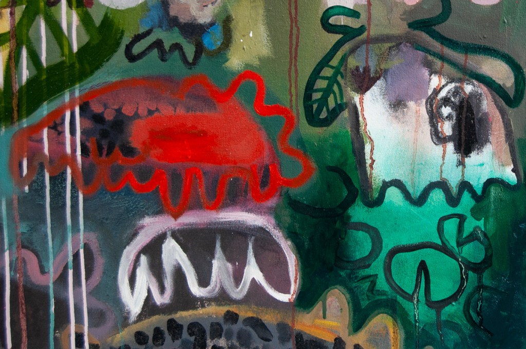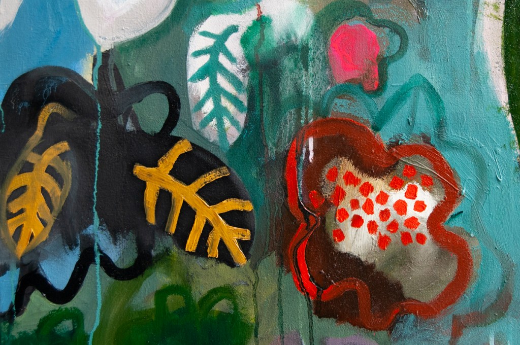 Now cut into five separate canvases, reworked as a pentaptych [pen-tap-tick] and updated with a sunken central figure in a frame. Each panel represents both the constant growing and dying flora (plants and flowers) and the theatre of fauna (animals) within a garden. When fully assembled it is an altarpiece to what one might call ‘gardening as method’.