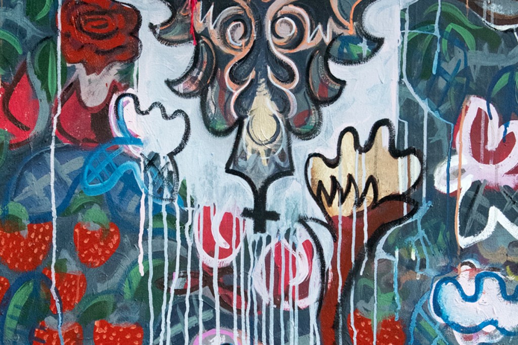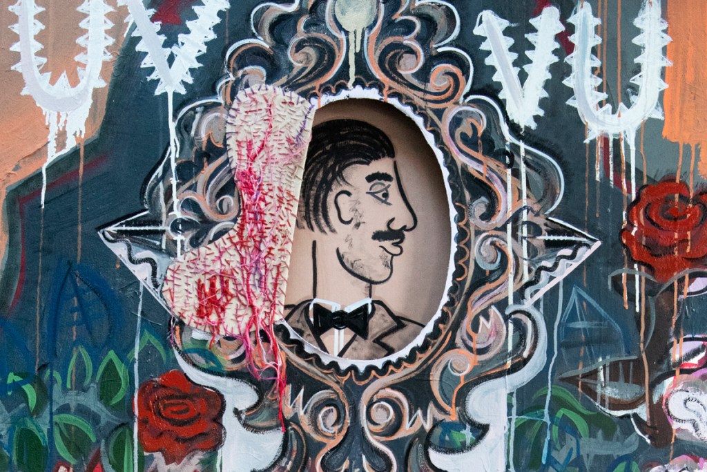 Now cut into five separate canvases, reworked as a pentaptych [pen-tap-tick] and updated with a sunken central figure in a frame. Each panel represents both the constant growing and dying flora (plants and flowers) and the theatre of fauna (animals) within a garden. When fully assembled it is an altarpiece to what one might call ‘gardening as method’.