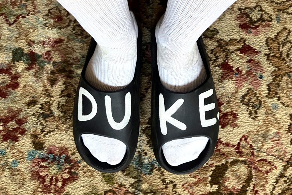 Luke wears Spring/Summer collection t-shirt, cargo shorts and hoodie with wide sun hat and DUKE slides.