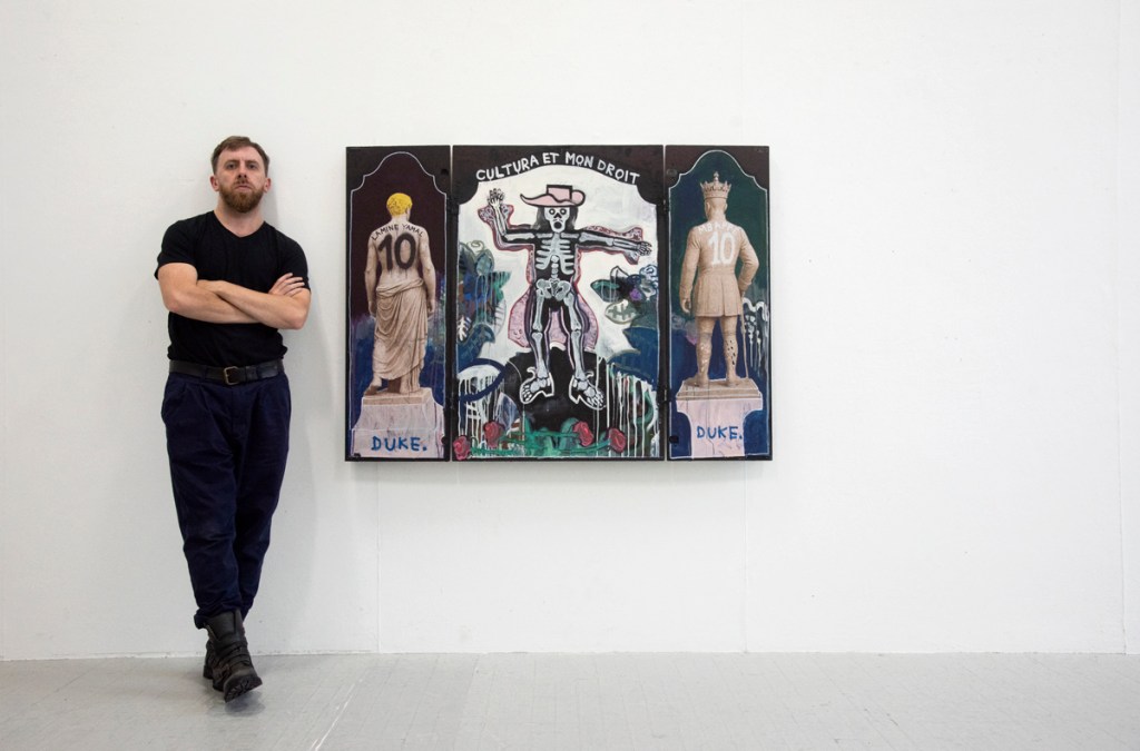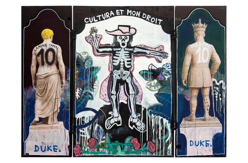 Artists once built statues of Gods and monarchs, but in the modern era we give our allegiances to popular culture, sports teams and brands. Traditionally the interior of the doors of religious altarpieces are adorned with saints. Here this takes place with the vandalism of statues in Barcelona and Madrid – the names of their respective talismen painted to resemble their jerseys. Loyalty is transferred from church to stadium, from sovereign to celebrity.