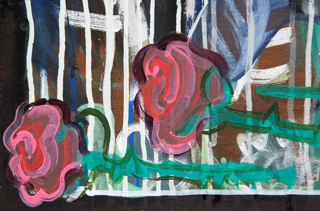 Oil, emulsion, glitter and paint pens on wardrobe doors on wood panel