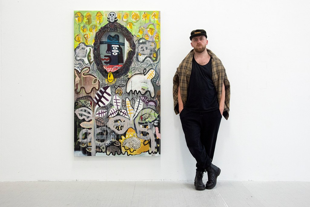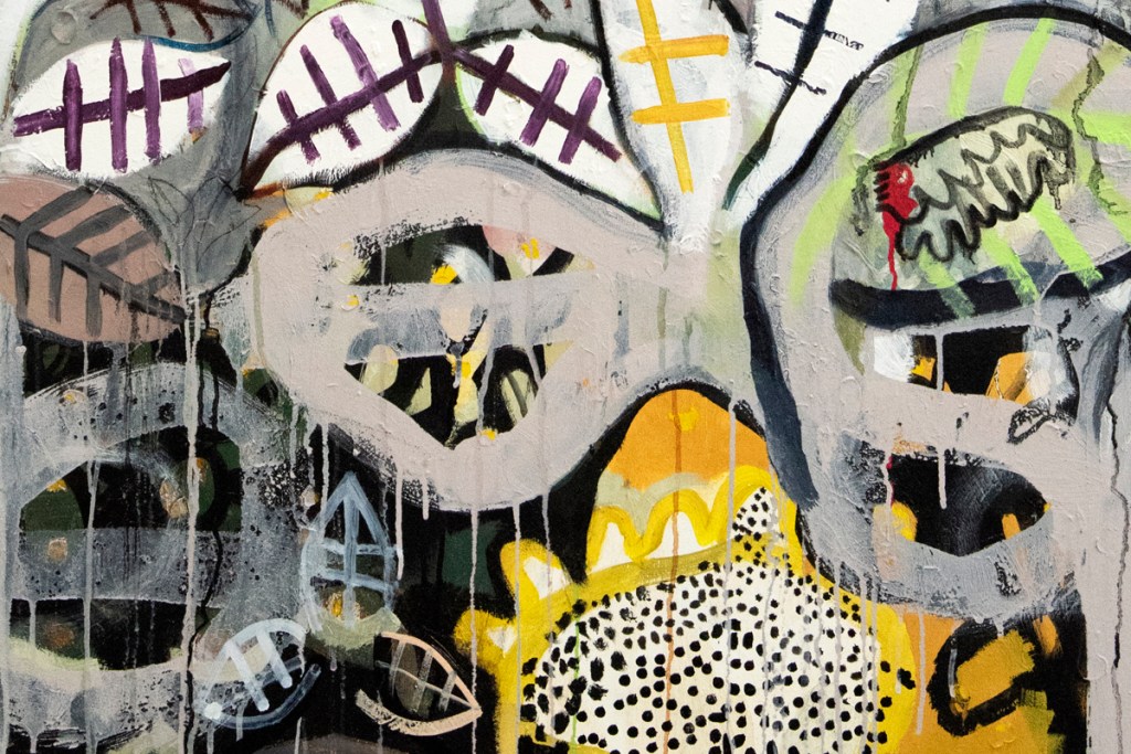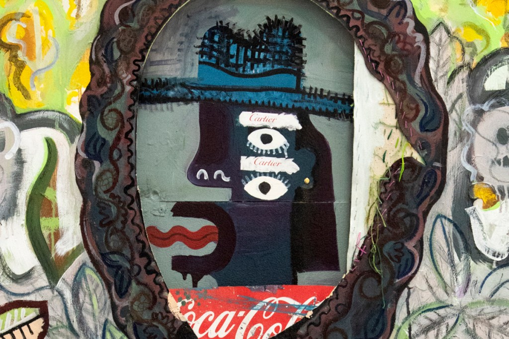 Oil, emulsion, paint pens, cardboard and thread on canvas.