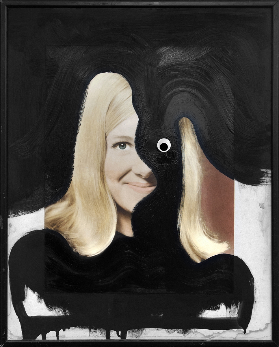 Paper, oil, papier-mâché, acrylic, paint pens and chalk on framed canvas.